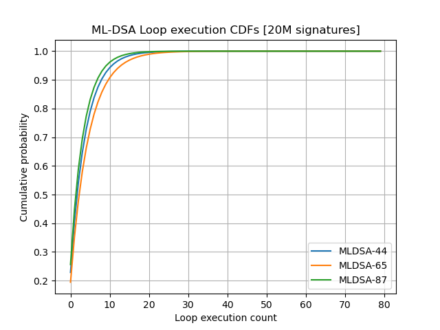 • ML-DSA-65 (NIST Category 3, most deployed) expects roughly 5 attempts on average